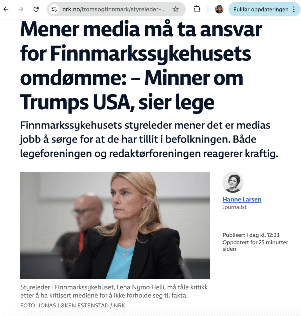 På styremøte i Finnmarkssykehuset i dag, 29. oktober, sa styreleder Nymo Helli følgende gjengitt av NRK: « ….generelt så har jeg lyst til å si at vi har alle et ansvar. Vi som sitter i styret, Finnmarkssykehuset og også media, til å sørge for at vi får en god tillit og et godt omdømme.» Det […]